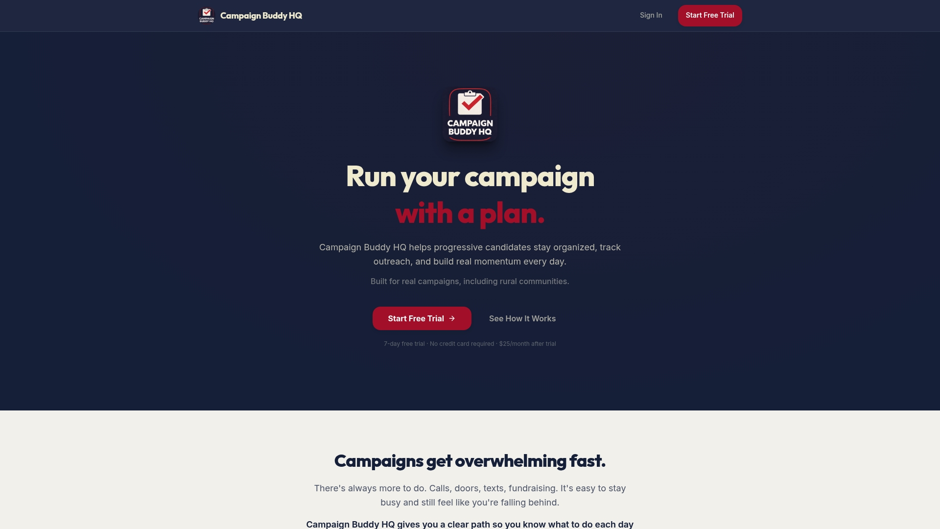 Whether you are running a local race or scaling a regional effort, Campaign buddy HQ is built for the realities of grassroots organizing, including rural and low-density communities where every contact counts. Use the vote goal calculator to set realistic targets, and explore the AI campaign overview to get data-driven guidance tailored to your race. Start your free 7-day trial today. No credit card required.