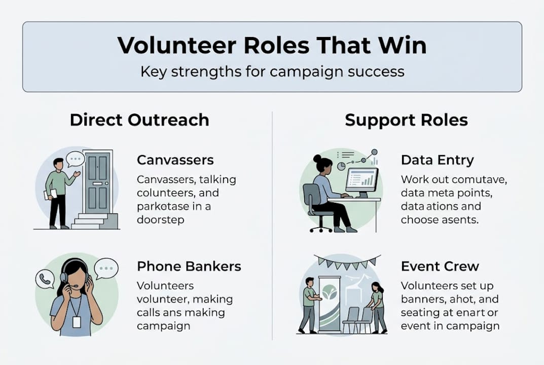 Each role requires a different skill set and a different level of commitment. A volunteer who thrives at a phone bank may feel overwhelmed canvassing alone. A social media-savvy college student may not want to spend six hours making calls. When you match people to the right role from the start, retention goes up and productivity follows.