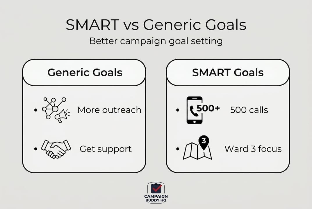 The SMART framework isn't new, but campaigns consistently underuse it because goal writing feels abstract compared to the urgency of canvassing. Make it a ritual. Set aside 30 minutes each week to review and refine goals with your team leads. That habit pays off.