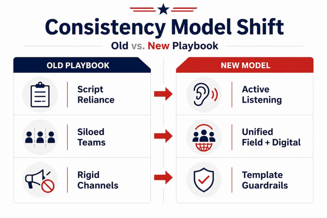 The misconception that trips up most managers is equating consistency with rigidity. Running the same word-for-word script in October as you did in June is not consistency. It is stagnation. Real consistency lives at the message level, not the script level. Your core argument, the reason voters should choose your candidate, should remain stable. The tactics, tone, and targeting around that argument should evolve as the campaign moves through its phases.